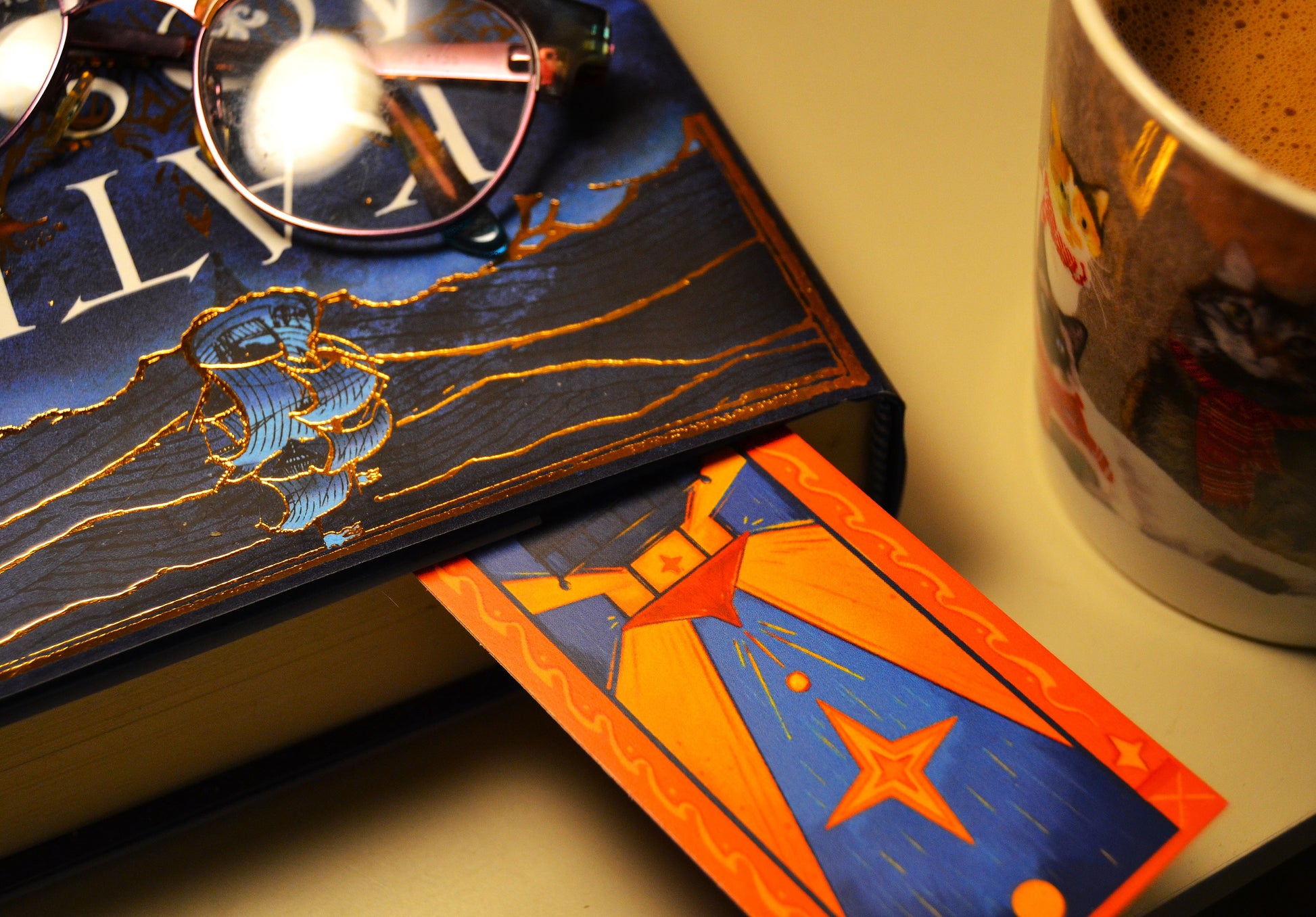 This vibrant digitally illustrated bookmark showcases a glowing lighthouse piercing the night sky, framed by a decorative border this is perfect for book lovers who appreciate unique, colourful artwork.