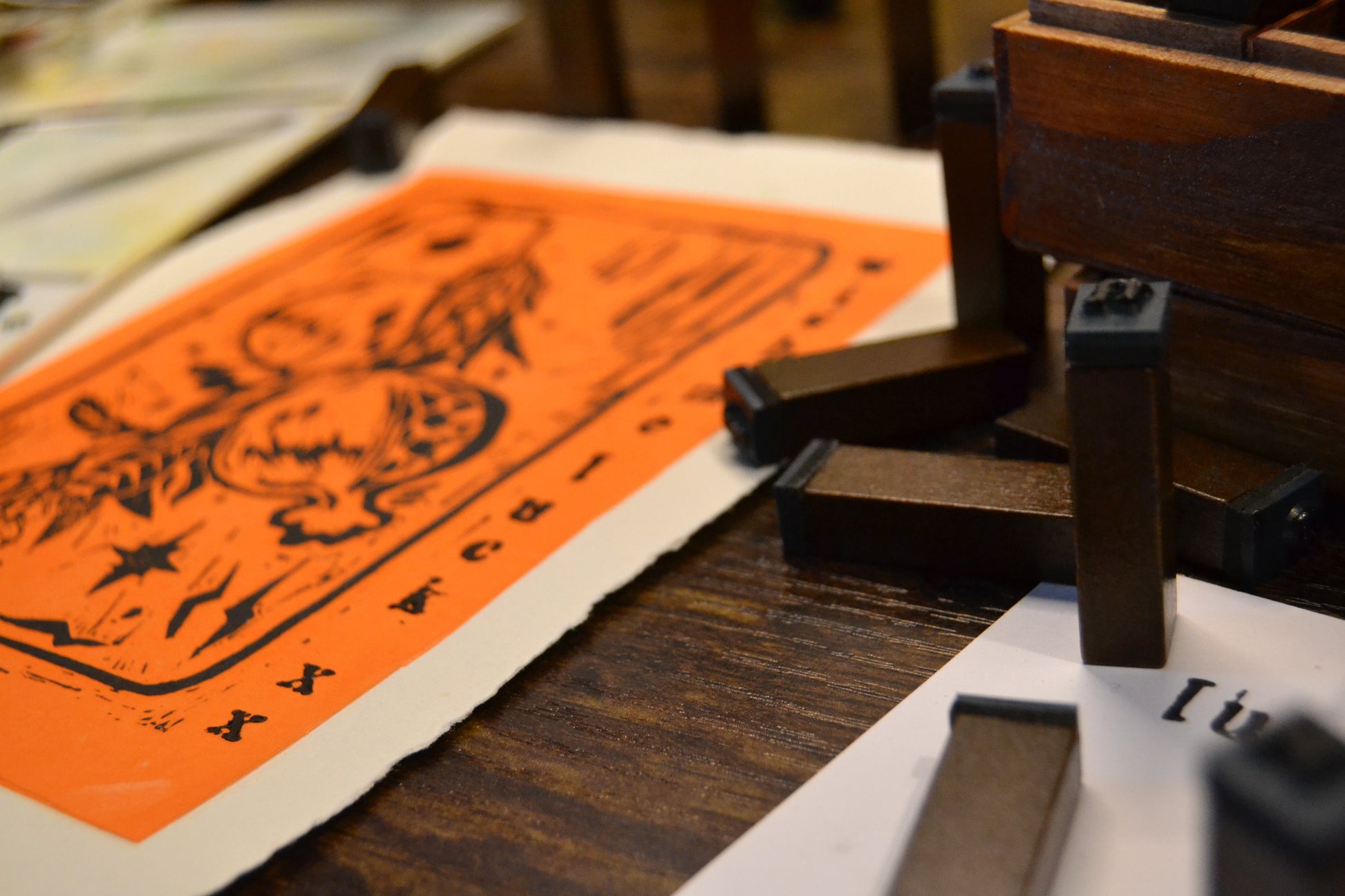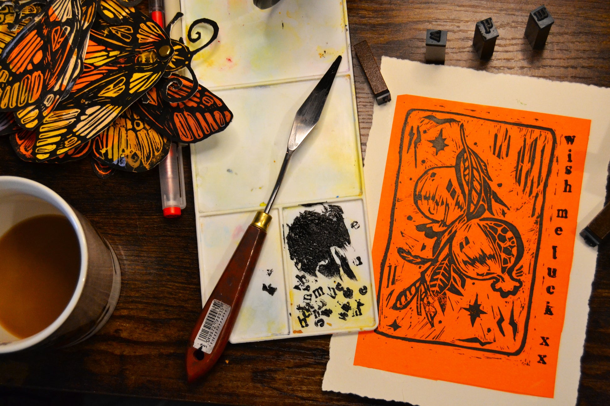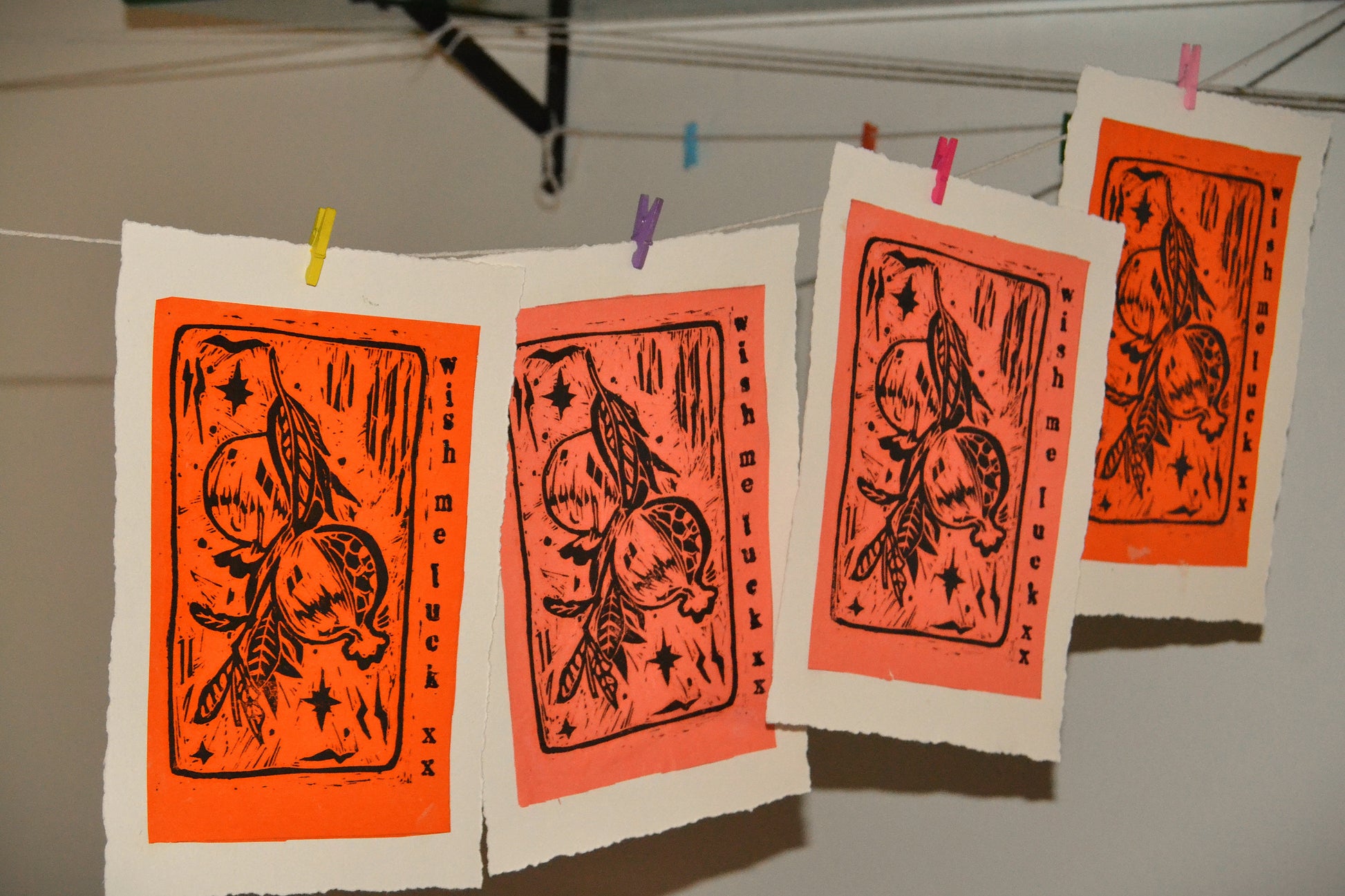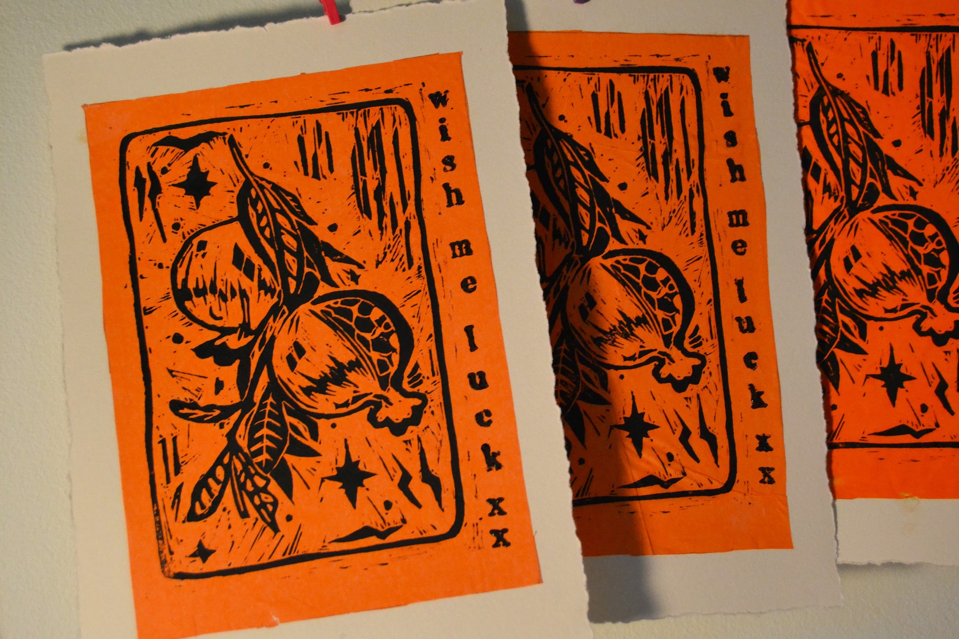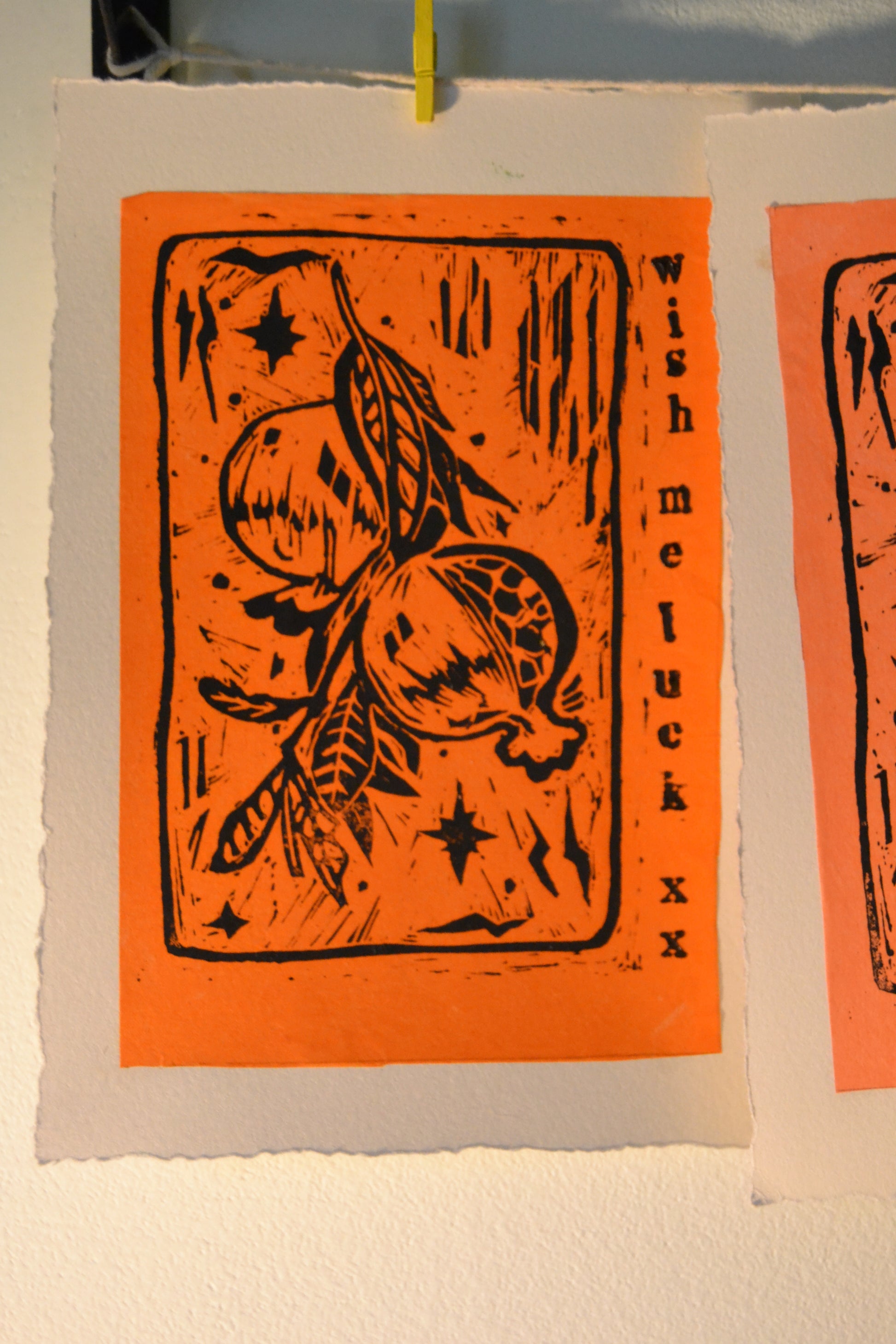 Hand printed relief linocut print on dreckled edge paper.